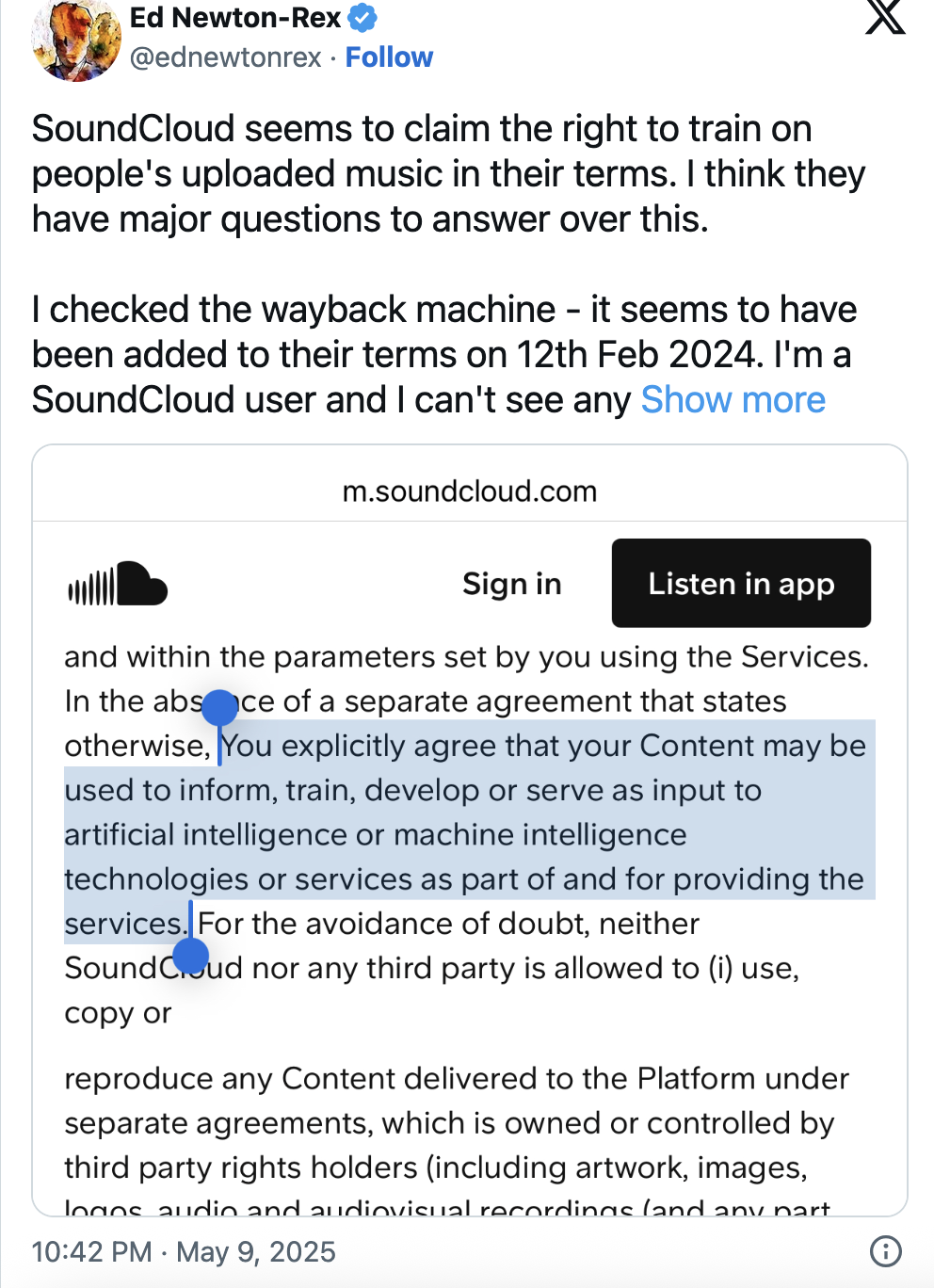 In response to the backlash, SoundCloud clarified that it has not used artist content to train AI models and does not permit third parties to do so. The company emphasized that the updated terms aim to clarify the use of AI within its platform for features like personalized recommendations and content organization, not for training generative AI models .